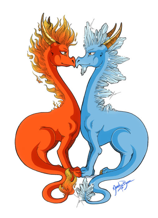 Zestawienie dwóch smoków. Pierwszy reprezentuje słowo „Ciepły” drugi zaś „Zimny”. Tak jak w poprzednich ilustracjach z tej serii lineart został wykonany cienkopisami, tradycyjnie zaś kolory zrobiłam w Adobe Photoshop CS6.