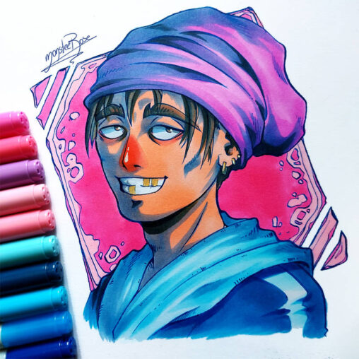 Ilustracja koncepcyjna, szybki projekt postaci stworzonej na potrzeby personalnego komiksu. Tu po wielu szkicach uwieczniłam go w mniej bałaganiarskiej wersji. Wykonane cienkopisami (lineart) oraz Copic Markerami (kolory).